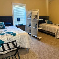 🛏️ Bedroom & Bathroom Breakdown Ground Floor Bedroom 1 • 2 Full beds • Room divider • Sleeps up to 4 • Shares Jack-and-Jill bathroom with Bedroom 2 (2 showers + 1 bathtub) Bedroom 2 • 2 Full beds • Sleeps up to 4 • Shares Jack-and-Jill bathroom with Bedroom 1 Bedroom 8 (Primary Suite) • King bed (can convert to 2 Twin XLs) • Twin bunk bed (to be replaced in July with a twin sleeper sofa + trundle) • Sleeps up to 4 • En suite bathroom with 2 sinks, shower, and garden tub (jets currently non-functional) Bedroom 9 • Full-over-Full bunk bed • Full-over-Full futon • Sleeps up to 4 • Includes desk, monitor, computer, and printer • Has easy access to Bedroom 8’s bathroom or can use the centrally located main bathroom with shower Upstairs Bedroom 3 • King bed (can convert to 2 Twin XLs) • Sleeps 1–2 • Uses hallway-accessible shared bathroom (with Bedroom 4) Bedroom 4 • King bed (can convert to 2 Twin XLs) • Sleeps 1–2 • Has direct access to shared bathroom Bedroom 5 • 2 Queen beds • Room divider • Sleeps up to 4 • Shares bathroom with Bedroom 6 Bedroom 6 • 2 Full beds • Twin sleeper sofa + Twin trundle • Sleeps up to 6 • Shares bathroom with Bedroom 5 Bedroom 7 • 6 Twin XL beds, including 2 built-in top bunks • Sleeps up to 6 • Has its own private bathroom Bathroom Overview • Jack-and-Jill (Bedrooms 1 & 2): 2 showers + 1 bathtub • Shared bath (Bedrooms 3 & 4) • Shared bath (Bedrooms 5 & 6) • Private bath in Bedroom 7 • En suite bath in Bedroom 8 (2 sinks, shower, garden tub) • Main central bathroom (with shower)